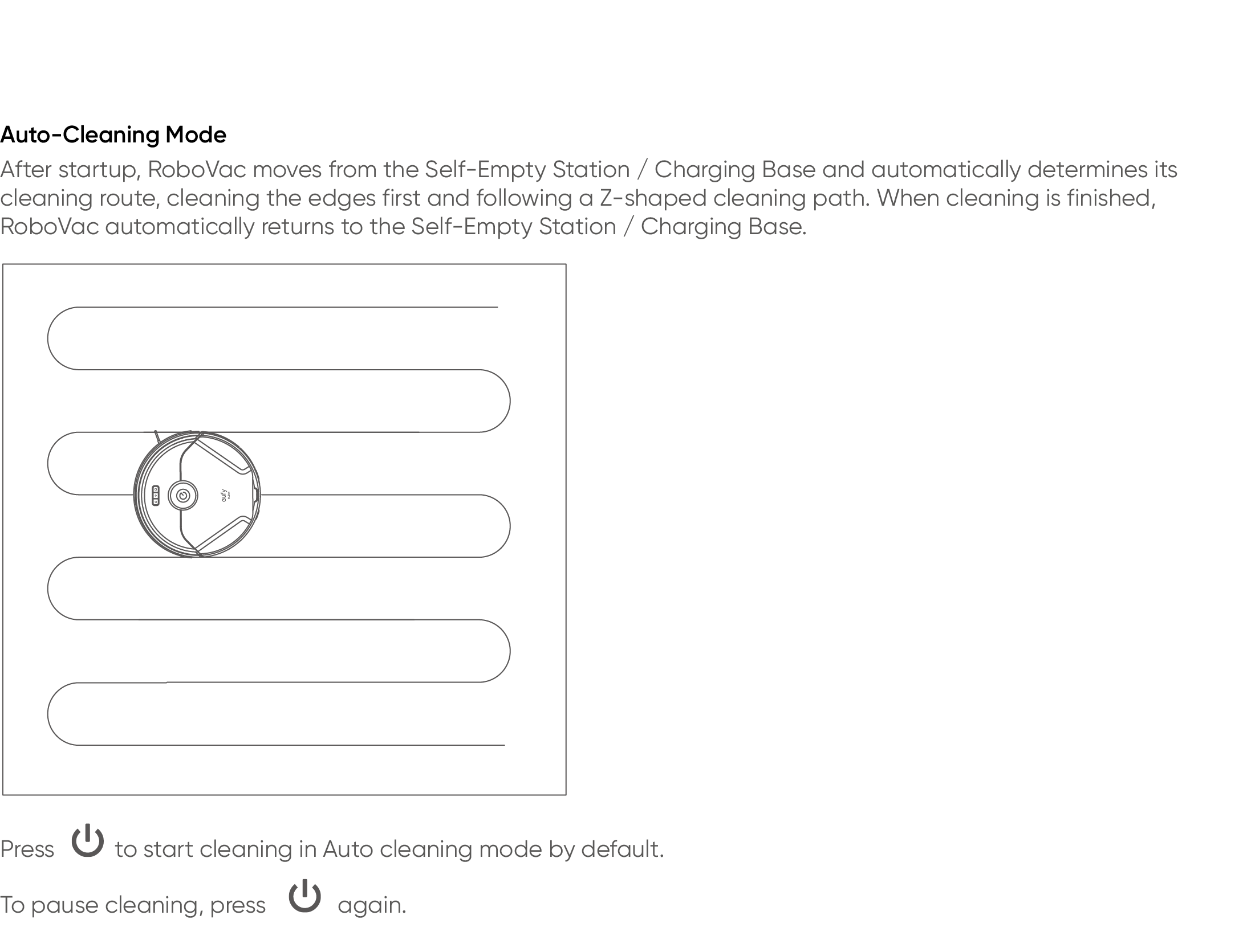 Press to return RoboVac to the Self-Empty Station / Charging Base; press to pause / finish the current task when working |