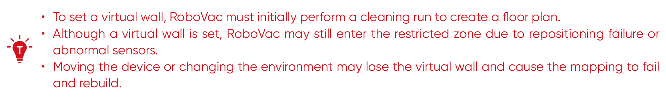 •Virtual Wall: RoboVac will not cross the virtual wall.